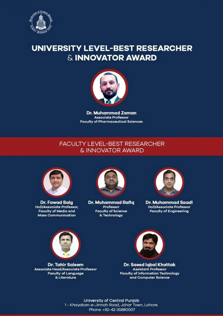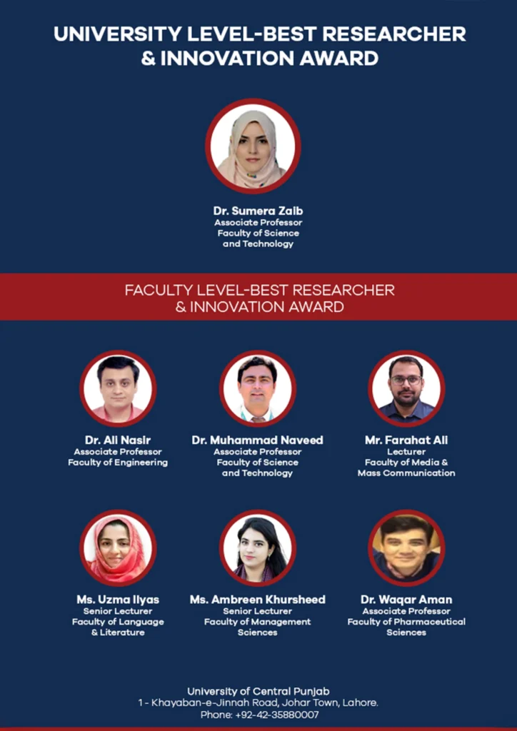 The practical outcome of faculty members’ collective research and innovative work is essential for the university to achieve its mission in the context of becoming a research-intensive institute, new knowledge discovery/creation through the latest research trends, and solving local techno-economic problems through innovative measures. In order to acknowledge the research and creative efforts of faculty members, University of Central Punjab (UCP) offers the Best Researcher and Innovator Award (BRIA), both at university and faculty levels, on account of extraordinary performance in his/her area of interest.