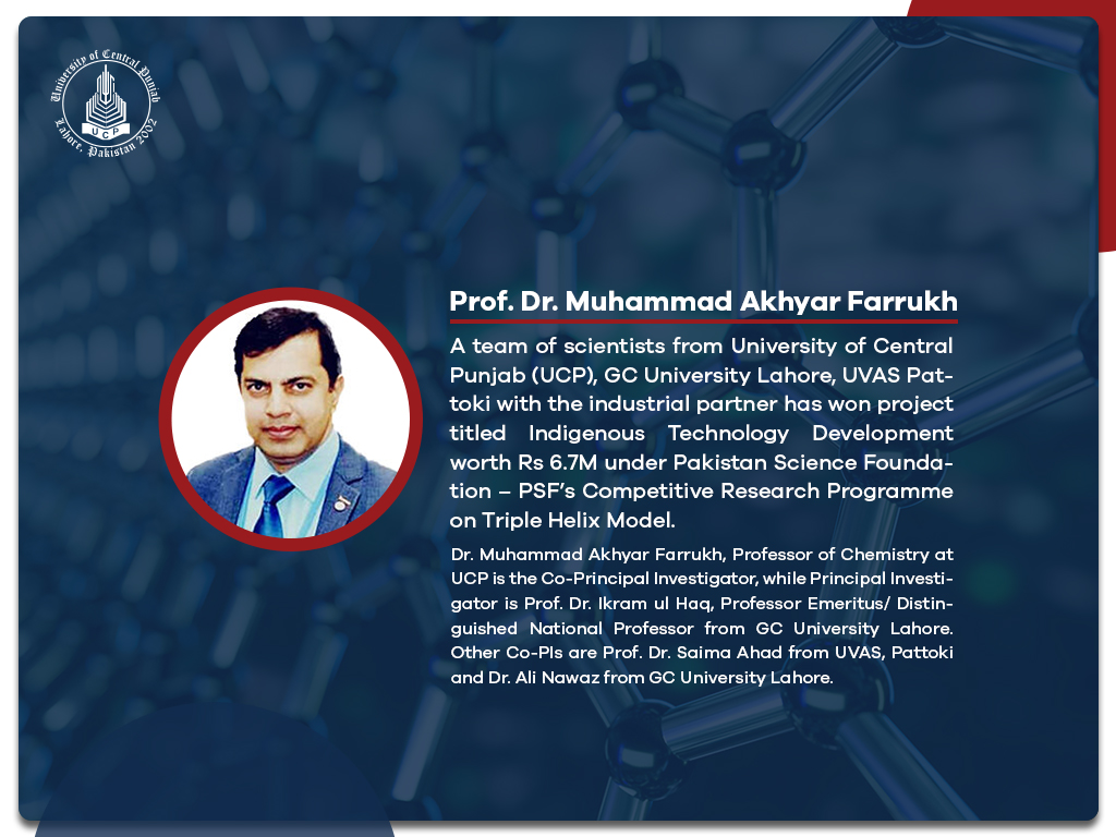 Dr. Muhammad Akhyar Farrukh, Professor of Chemistry at UCP is the Co-Principal Investigator, while Principal Investigator is Prof. Dr. Ikram ul Haq, Professor Emeritus/ Distinguished National Professor from GC University Lahore. Other Co-PIs are Prof. Dr. Saima Ahad from UVAS, Pattoki and Dr. Ali Nawaz from GC University Lahore