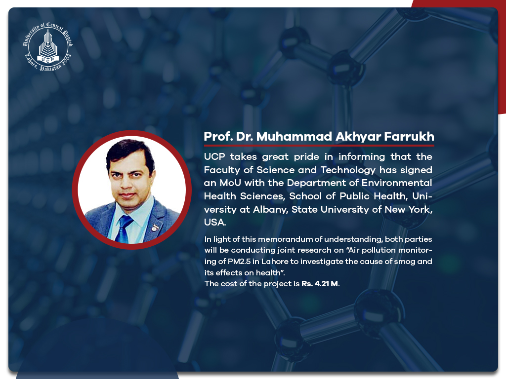 Dr. Muhammad Akhyar Farrukh will conduct this collaborative research project on air pollution monitoring, representing FOST-UCP, while the University at Albany, USA, will be represented by Dr. Haider A. Khwaja.