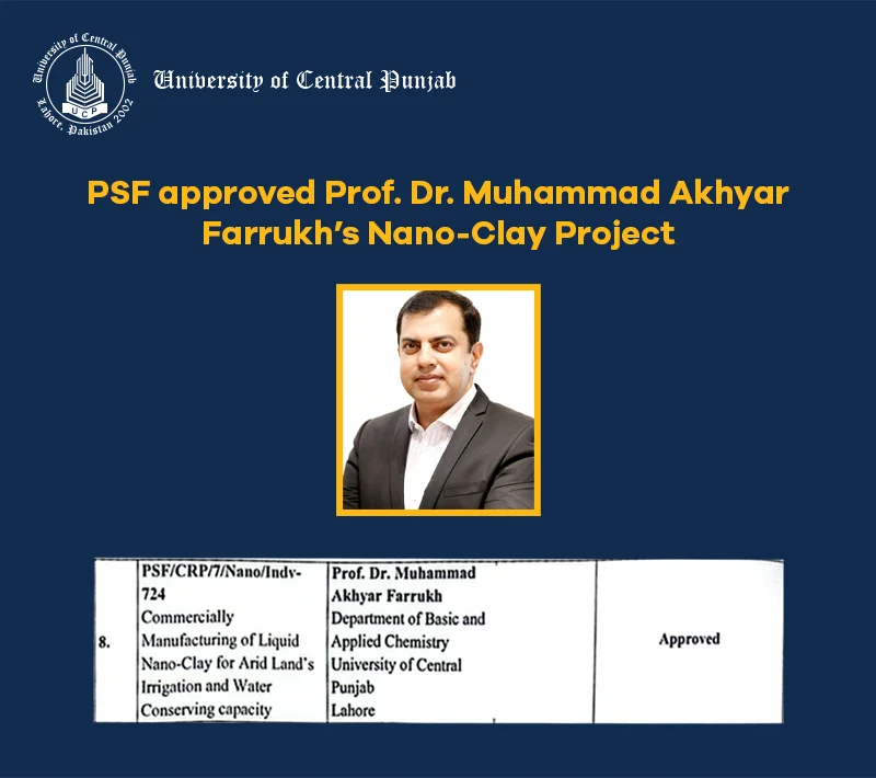 ORIC is pleased to announce that Prof. Dr. Muhammad Akhyar Farrukh, Director ORIC, has successfully secured Pakistan Science Foundation (PSF) approval for his research project titled “Commercial Manufacturing of Liquid Nano-Clay.”